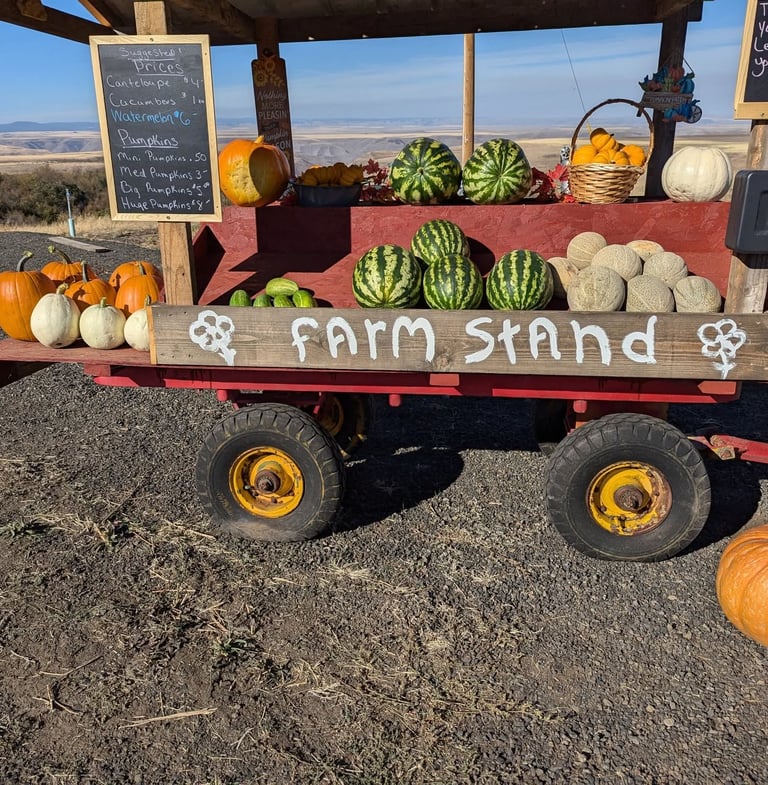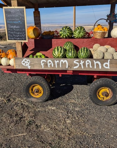 From June through September the farm shed is stocked with the sweetest cantaloupe and ripest watermelon and much more. Join us in September through October for U Pick pumpkins straight off the vine. Starting in July we stock the Redbird Canyon Farm Shed weekly with the freshest produce just steps from where it was harvested. If you can't make it out come see Sara at the Lewiston Farmer's Market June through September.